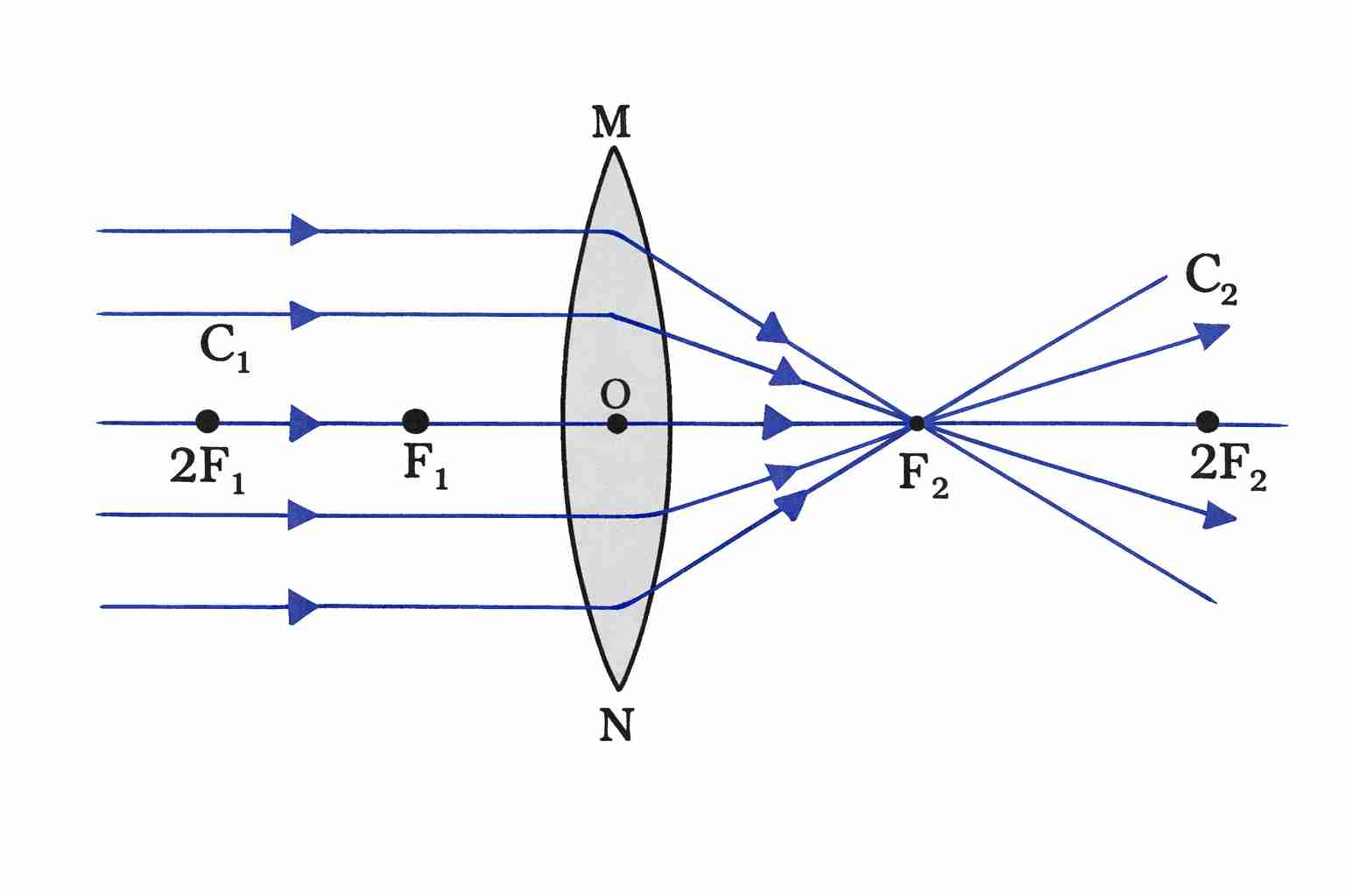 • Concave lens: A ray heading toward F₂ (on the opposite side) refracts and emerges parallel to the principal axis.