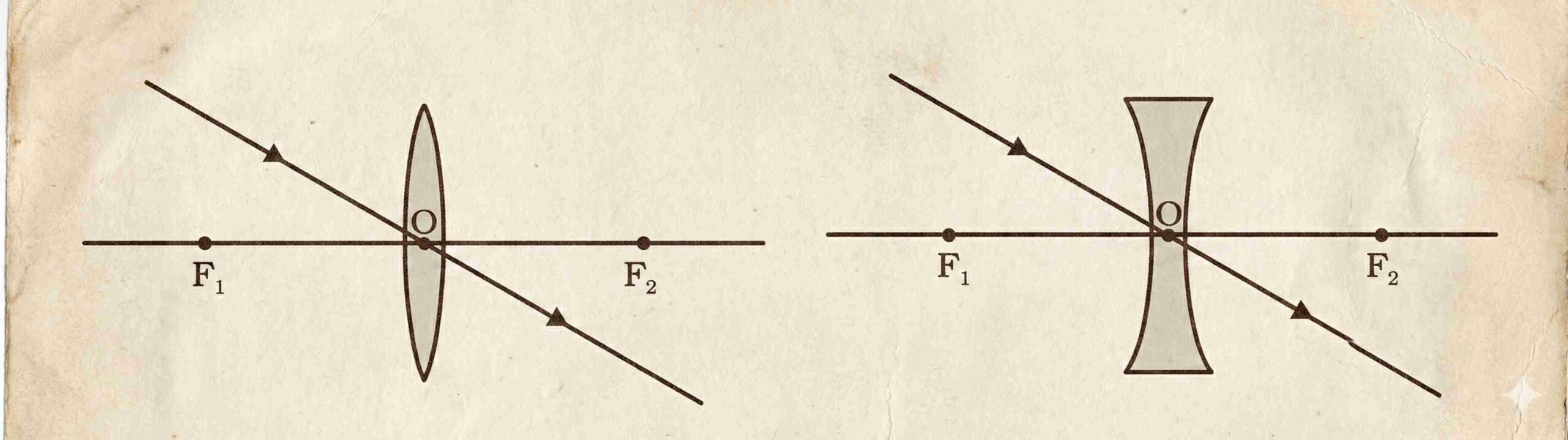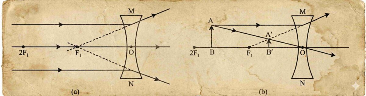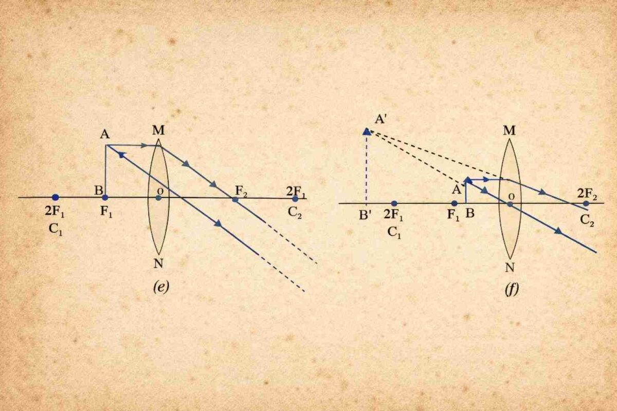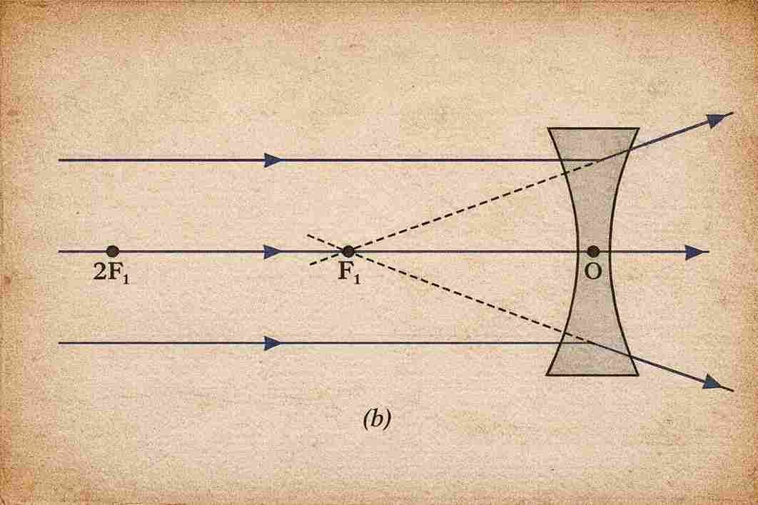 • Concave lens: After refraction, it appears to diverge from F₁ (focus on the same side).