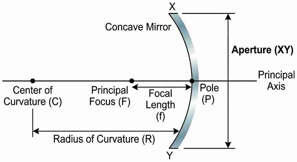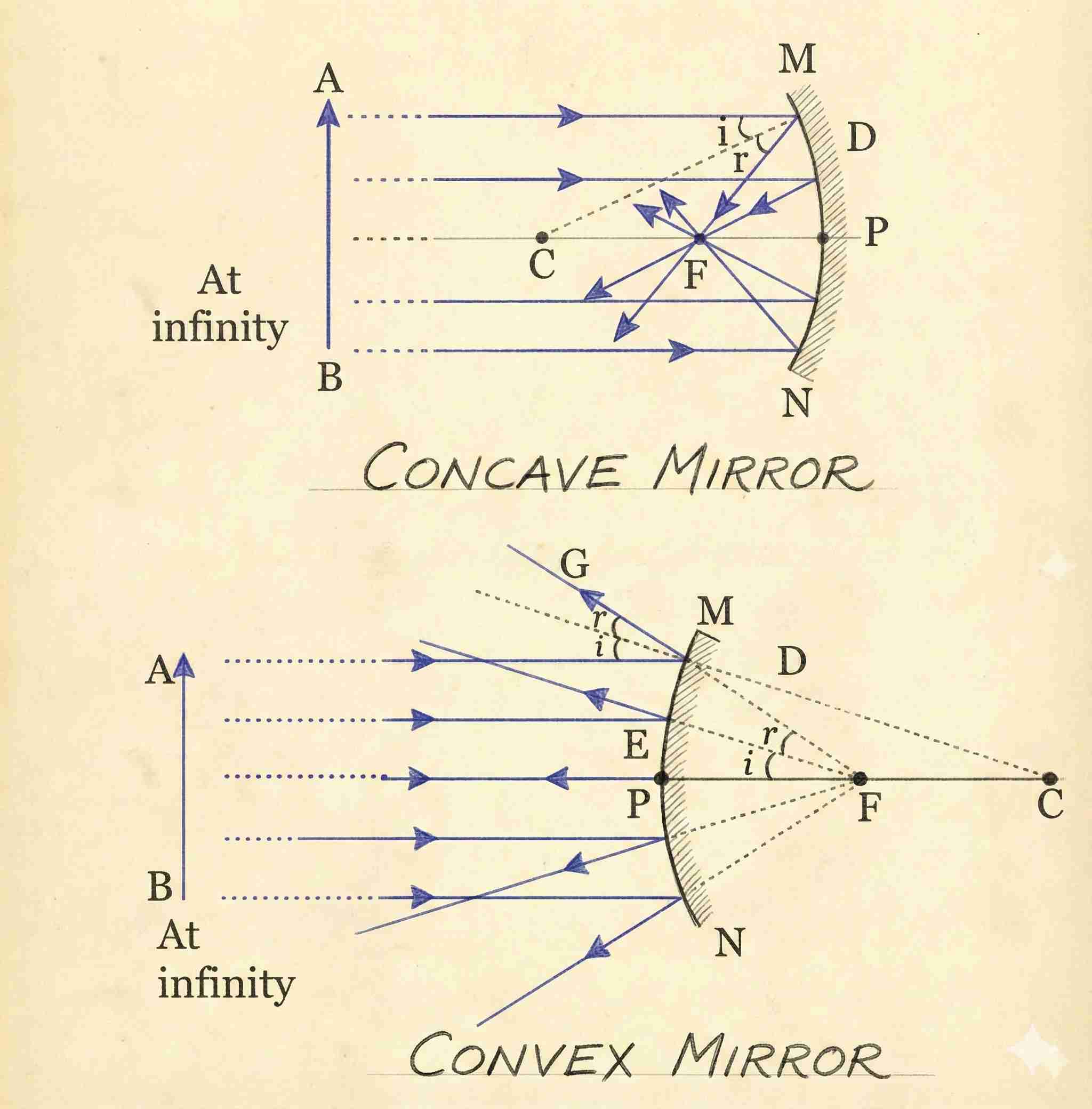Principal Focus (F)Concave: Point where parallel rays converge after reflection.