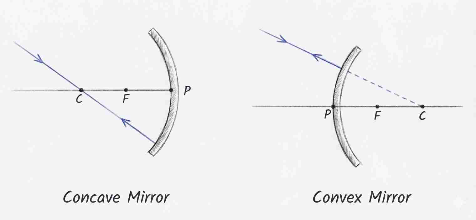 • Concave mirror: Reflecting surface curved inwards (toward the centre of the sphere).