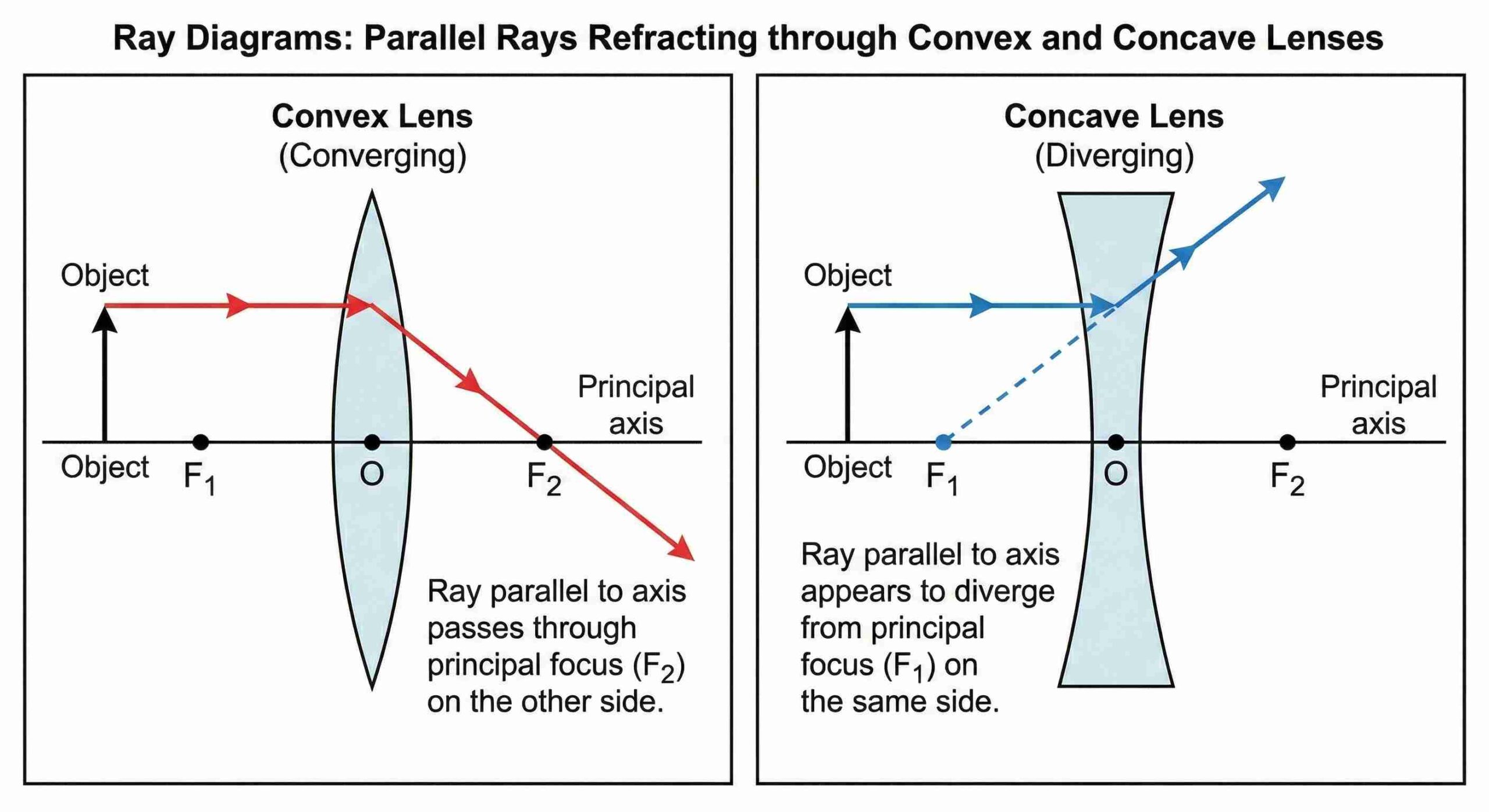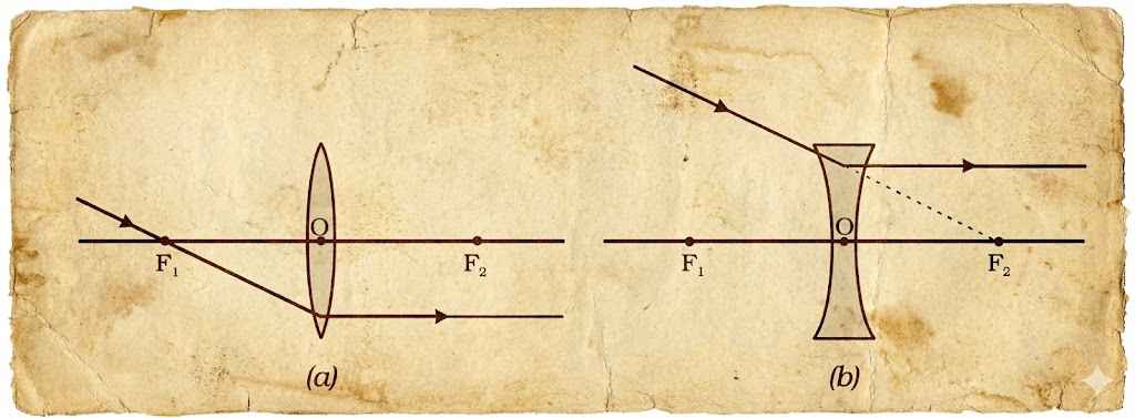• Convex lens: A ray passing through F₁ emerges parallel to the principal axis after refraction.