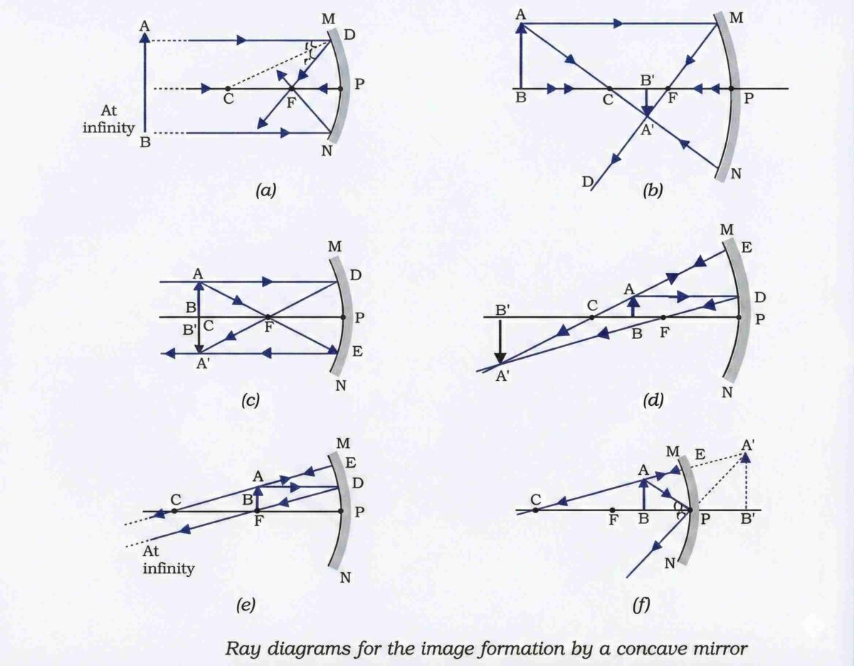 Note: Only when the object is between P and F is the image virtual and erect; all other positions yield real and inverted images.