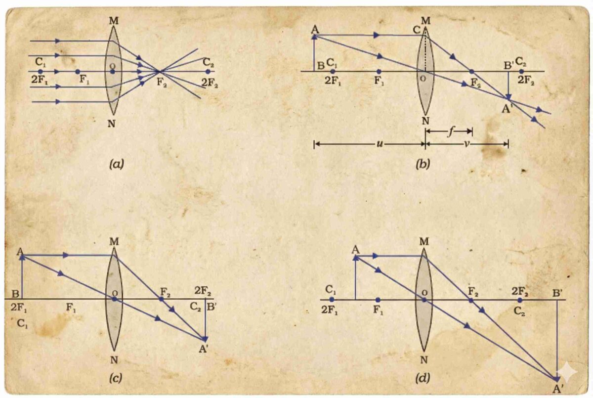 Note: Only when the object is between F₁ and optical centre (O) is the image virtual and erect; all other cases give real and inverted images.