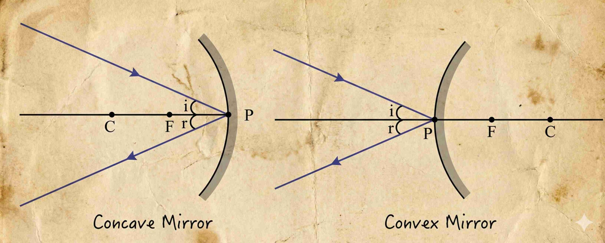 Pole (P)Centre of the reflecting surface (lies on the mirror).