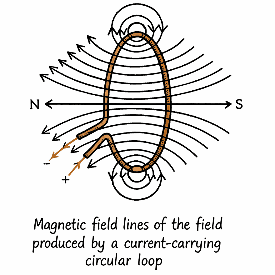 • Straight wire bent into circular loop → field lines form concentric circles around wire