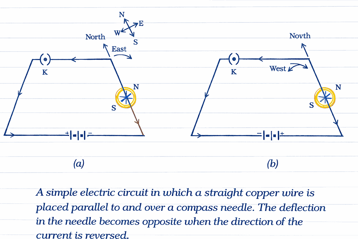 • The magnetic needle deflects near a current-carrying conductor